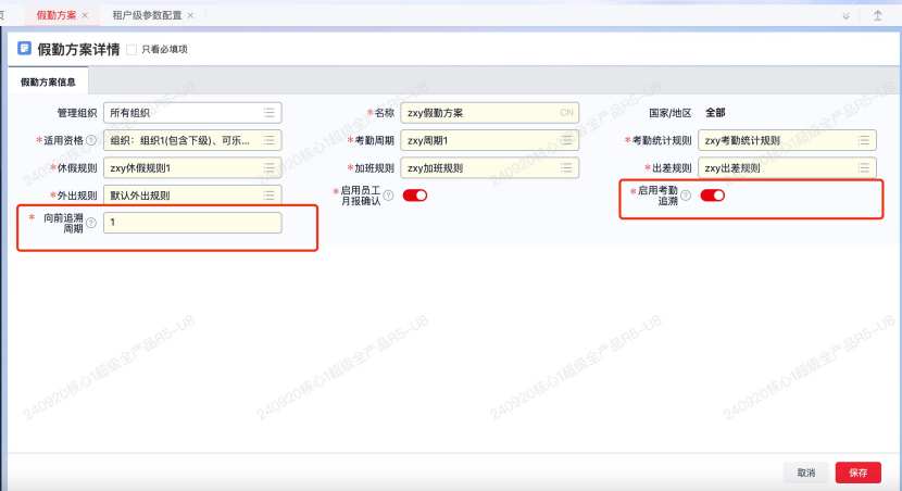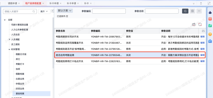 租户级参数开关: “是否启用考勤追溯” 为全局控制核心,开启后假勤方案详情将显示专属配置项,关闭则隐藏相关功能,默认状态为关闭,保障企业现有流程不受影响。