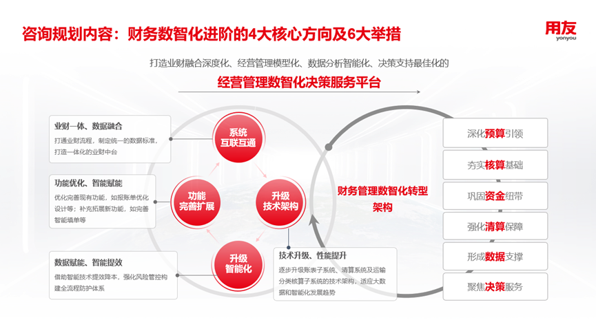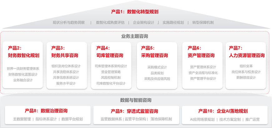 用友深度洞察大型企业需求,升级数智化咨询服务体系,涵盖数智化转型规划、业务主题咨询,数据与智能咨询三大类型,包含数智化转型规划、财务数智化规划、财务共享咨询、司库管理咨询、采购管理咨询、资产管理咨询、人力资源管理咨询、数据治理咨询、穿透式监管咨询、企业AI落地咨询10大数智化咨询服务产品,旨在为企业提供兼具前瞻性与落地性的数智咨询服务。