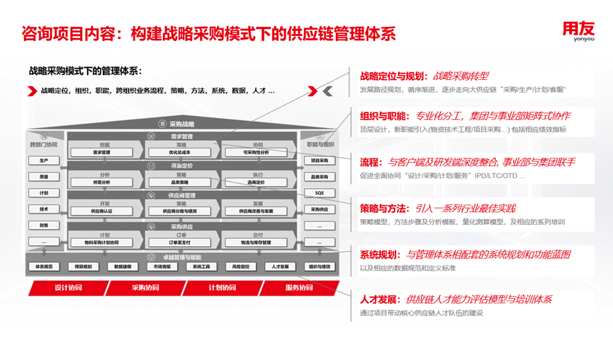 以采购全生命周期为切入点,从采购模式设计(战略采购、协同采购)到品类规划(战略品类、战术品类),再到采购及供应链风险(合规、履约、成本)与采购管理平台设计(系统功能、数据整合),构建高效、合规、降本的采购管理体系。