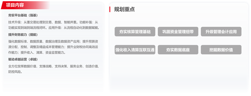 某大型交通运输央企升级财会信息系统,以 “强基、提能、卓越” 为目标,打造业财融合平台,强化数据治理与智能应用,实现财务从核算向价值创造转型。