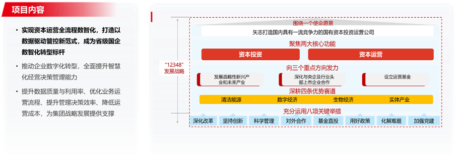 省级产业投资平台企业转型标杆,聚焦资本运营全流程数智化,构建 “13851” 转型框架,搭建 8 大应用平台,通过标准化与数据赋能,破解业务数智化不足、数据基础薄弱等难题。