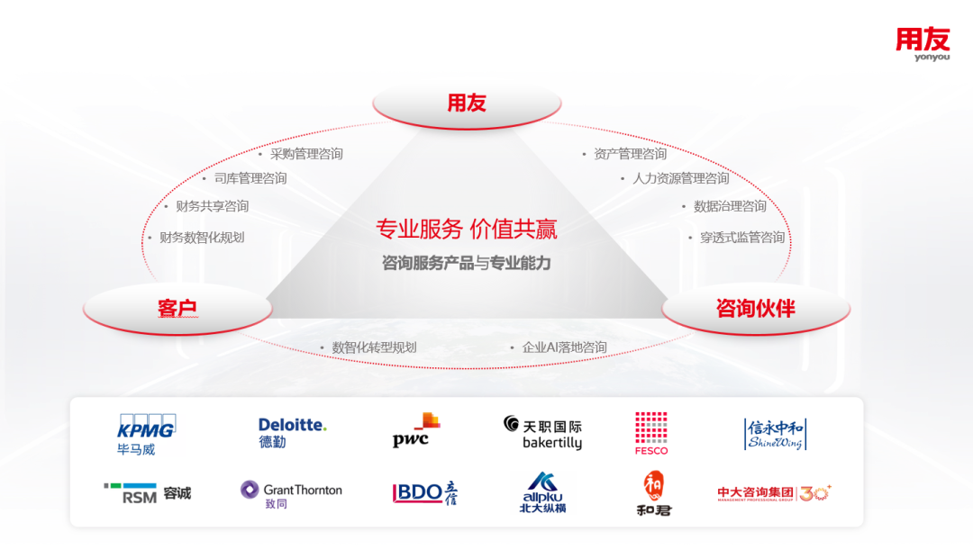 同时,用友联动头部咨询伙伴,以 “价值创造・生态共赢” 为核心,基于一致的客户诉求,以咨询服务产品与专业能力为纽带,向客户提供价值经营、管理变革、商业创新、用友网络科技等支持。